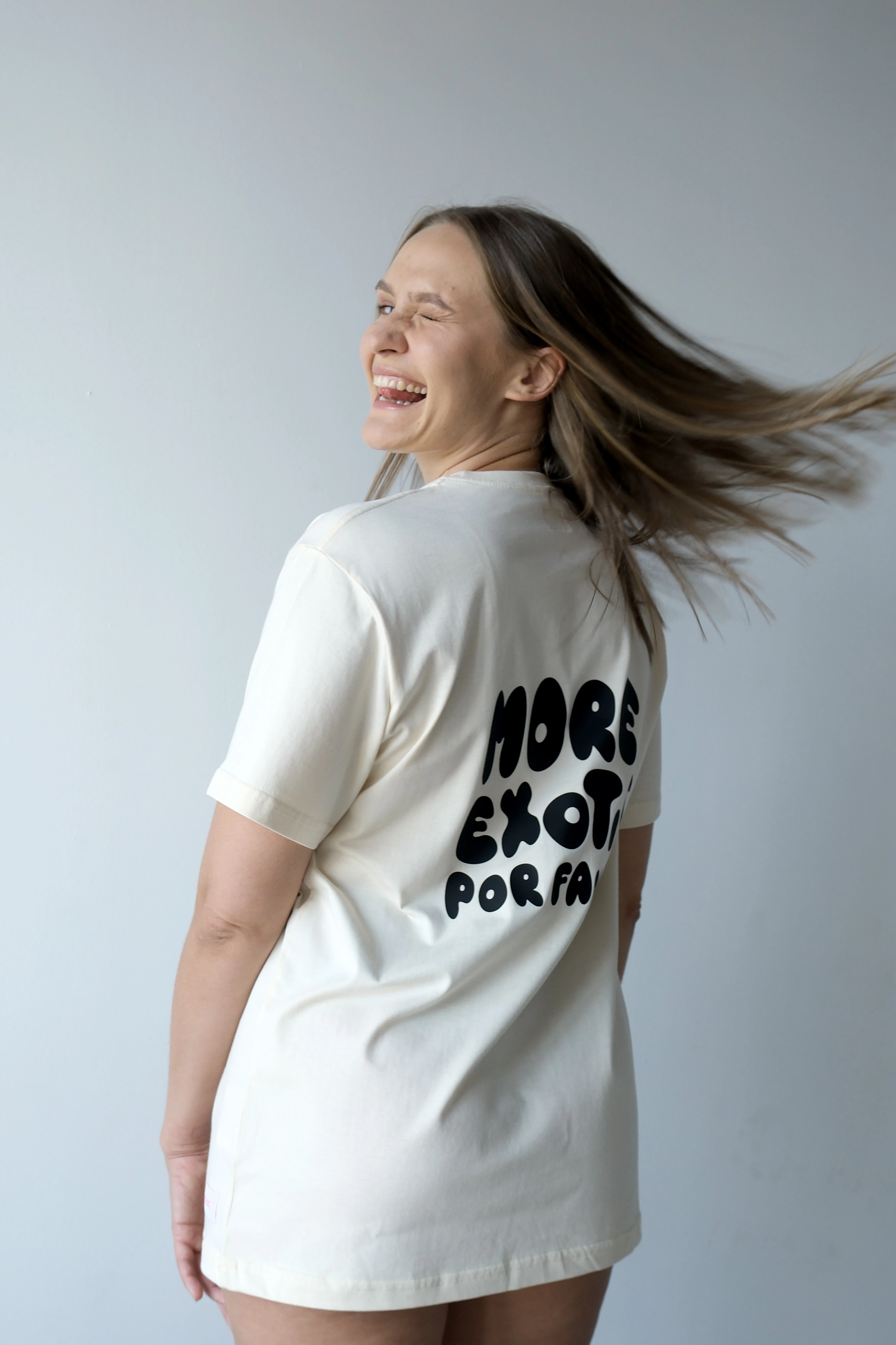 Our favorite oversized t-shirt is back in a fresh new version - in a soft buttery yellow and featuring the statement that says it all: MORE EXOTIC POR FAVOR.